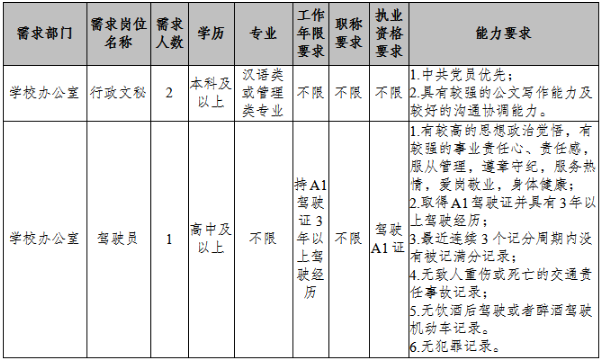 為適應學校發(fā)展的需要,需面向社會誠聘2名行政人員及1名駕駛員,現(xiàn)將有關事項公告如下: