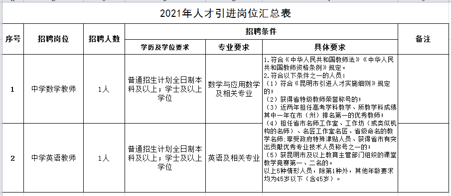為加強(qiáng)學(xué)校教師隊(duì)伍建設(shè),引進(jìn)優(yōu)秀師資,進(jìn)一步滿足人民群眾對(duì)優(yōu)質(zhì)教育資源的需求,根據(jù)我校教育教學(xué)工作需要,面向社會(huì)引進(jìn)省內(nèi)、外優(yōu)秀中學(xué)數(shù)學(xué)教師1人、英語(yǔ)教師1人。通過(guò)人才引進(jìn)的教師解決編制,納入昆明市事業(yè)單位人員管理。現(xiàn)將有關(guān)事項(xiàng)公告如下:
