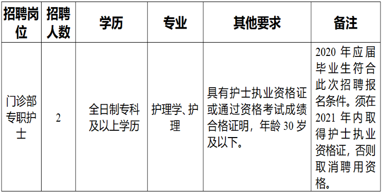 (六) 2020年應屆畢業(yè)生符合此次招聘報名條件,如被聘用,須在2021年內取得護士執(zhí)業(yè)資格證,否則取消聘用資格。